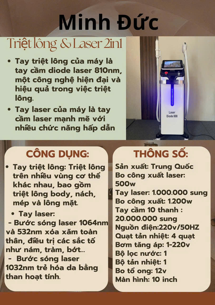 - Công nghệ: Sử dụng bước sóng đơn 808nm để phá hủy gốc nang lông bằng nhiệt năng.